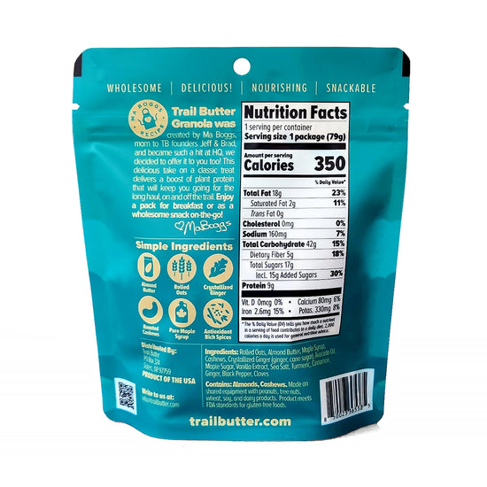Trail Butter Almond Butter Granola was created by Ma Boggs, mom to TB founders Jeff & Brad, and became such a hit at HQ, we decided to offer it to you too! This delicious take on a classic treat delivers a boost of plant protein that will keep you going for the long haul, on and off the trail. Enjoy a pack for breakfast or as a wholesome snack on-the-go!